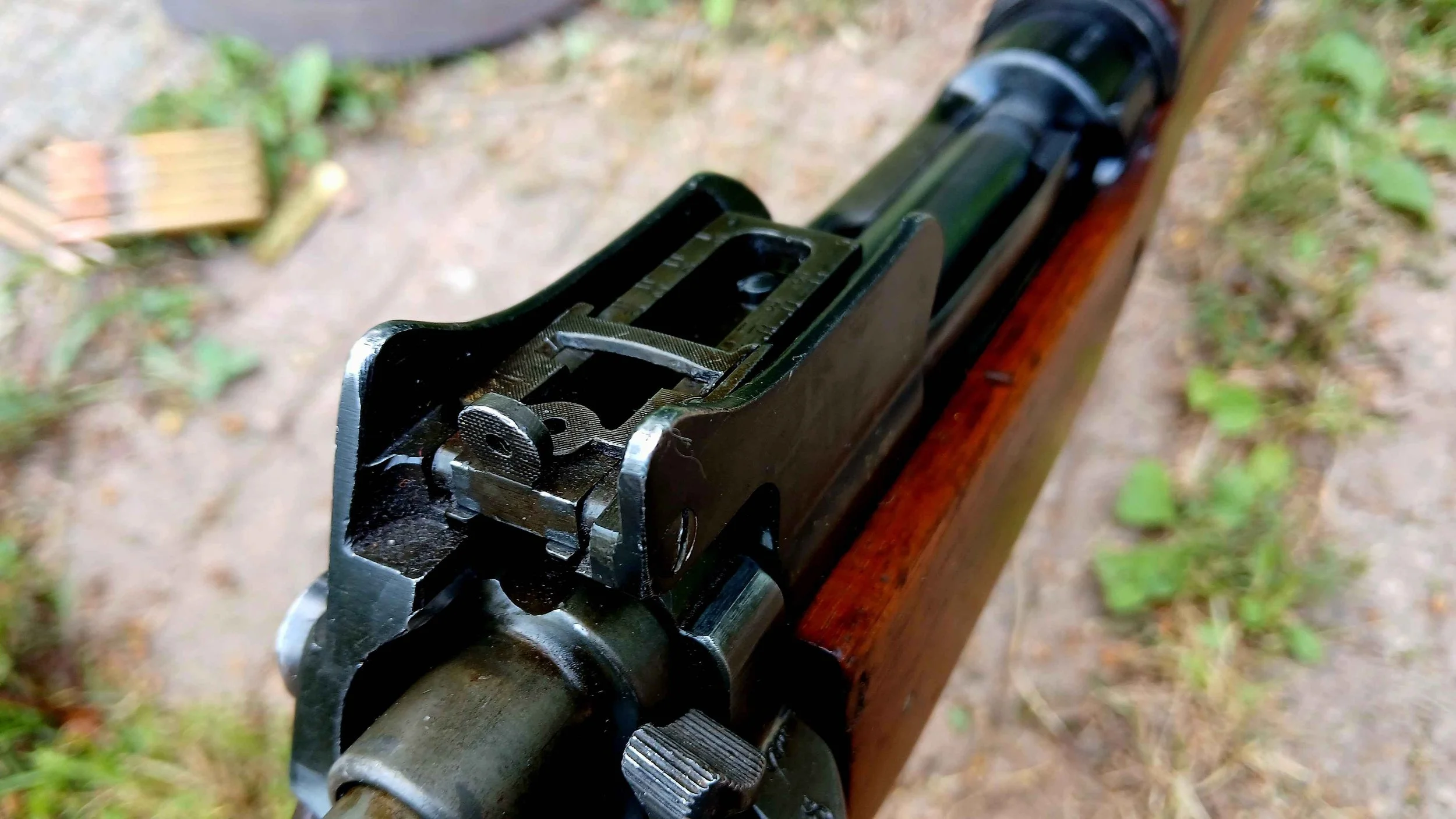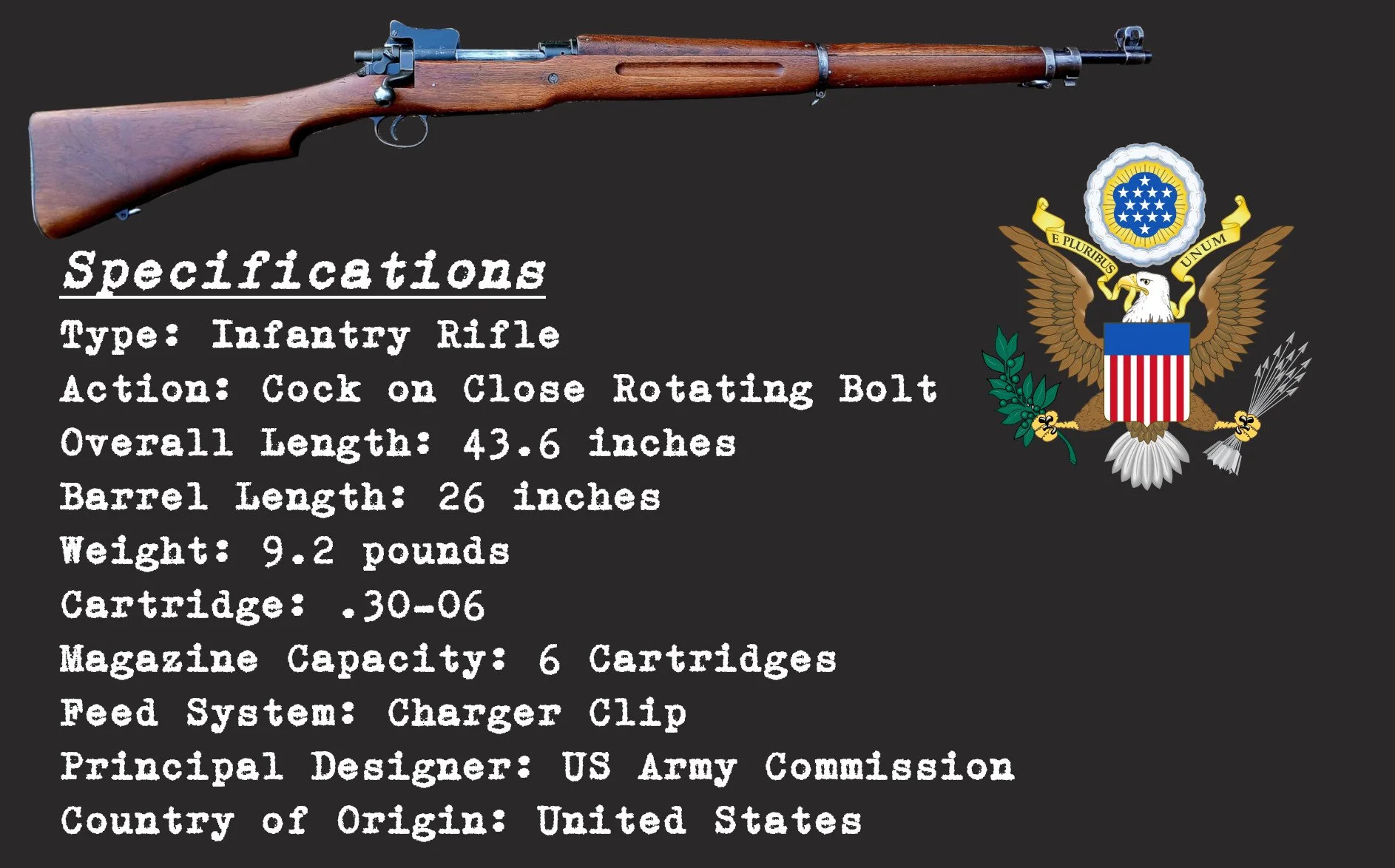 The rifle is fairly long and notably heavy, with its large receiver and heavy barrel, although this does aid in accuracy. The weapon is fed by standard US issue M1903 charger clips, and although the clips hold five cartridges, the magazine can actually comfortably hold six cartridges due to the smaller diameter of the .30-06 case compared to .303 or .276 Enfield.